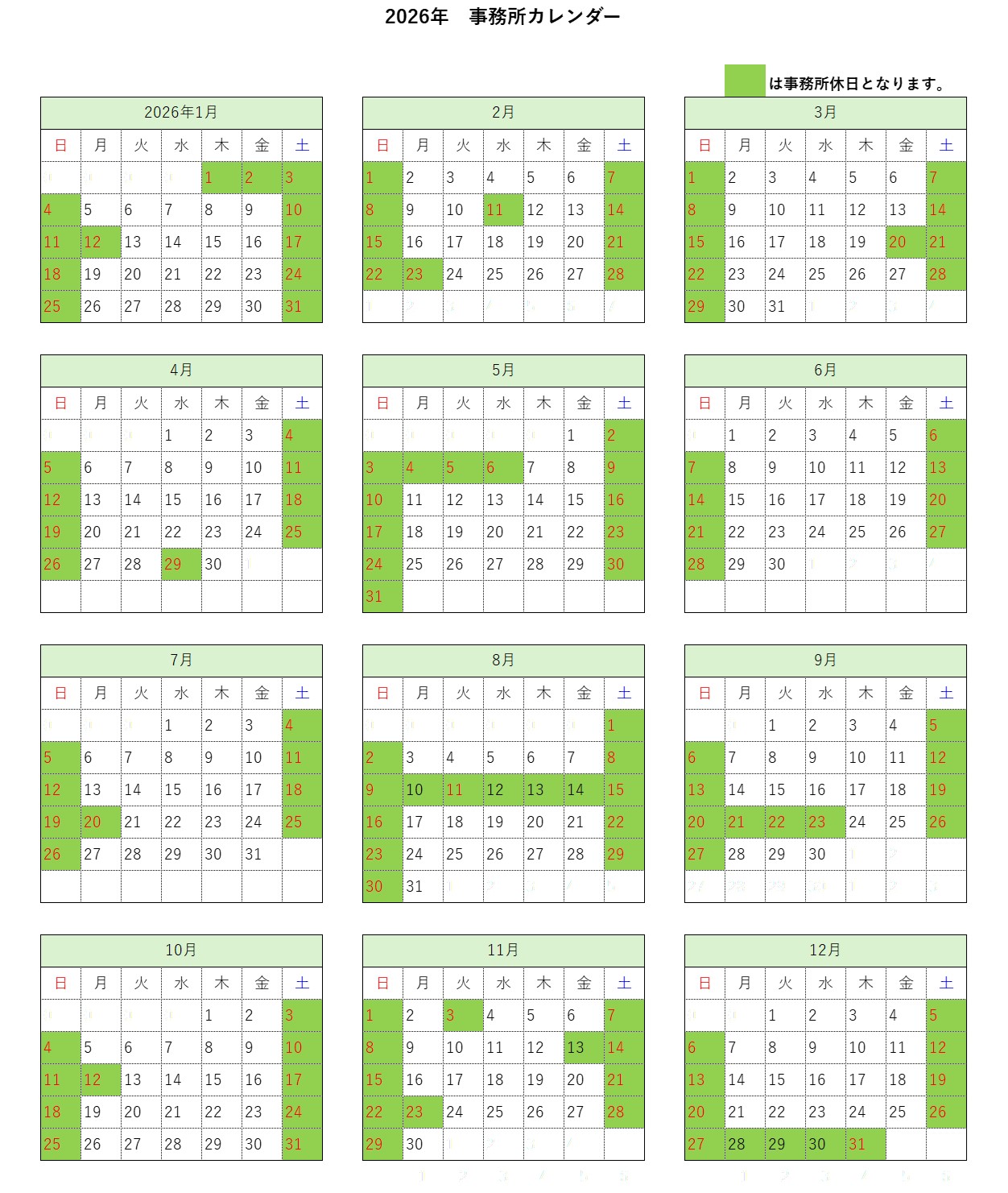 2026 事務所カレンダー